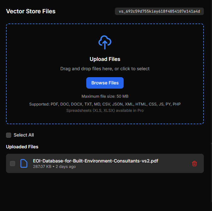 Share access to OpenAI vector stores where you can upload documents and other file types, and use them as context for your chatbot right away!